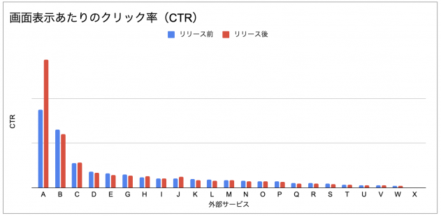 - リリース前後の各サービスの画面(PV)あたりのCT数(CTR)を比較する