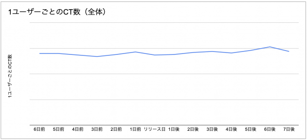全体のCT数は若干向上したものの大きな変化はなく、ユーザあたりのCT数で見てみるとほぼ横ばいのため、リリース1週間ではCT数の向上は見られませんでした。